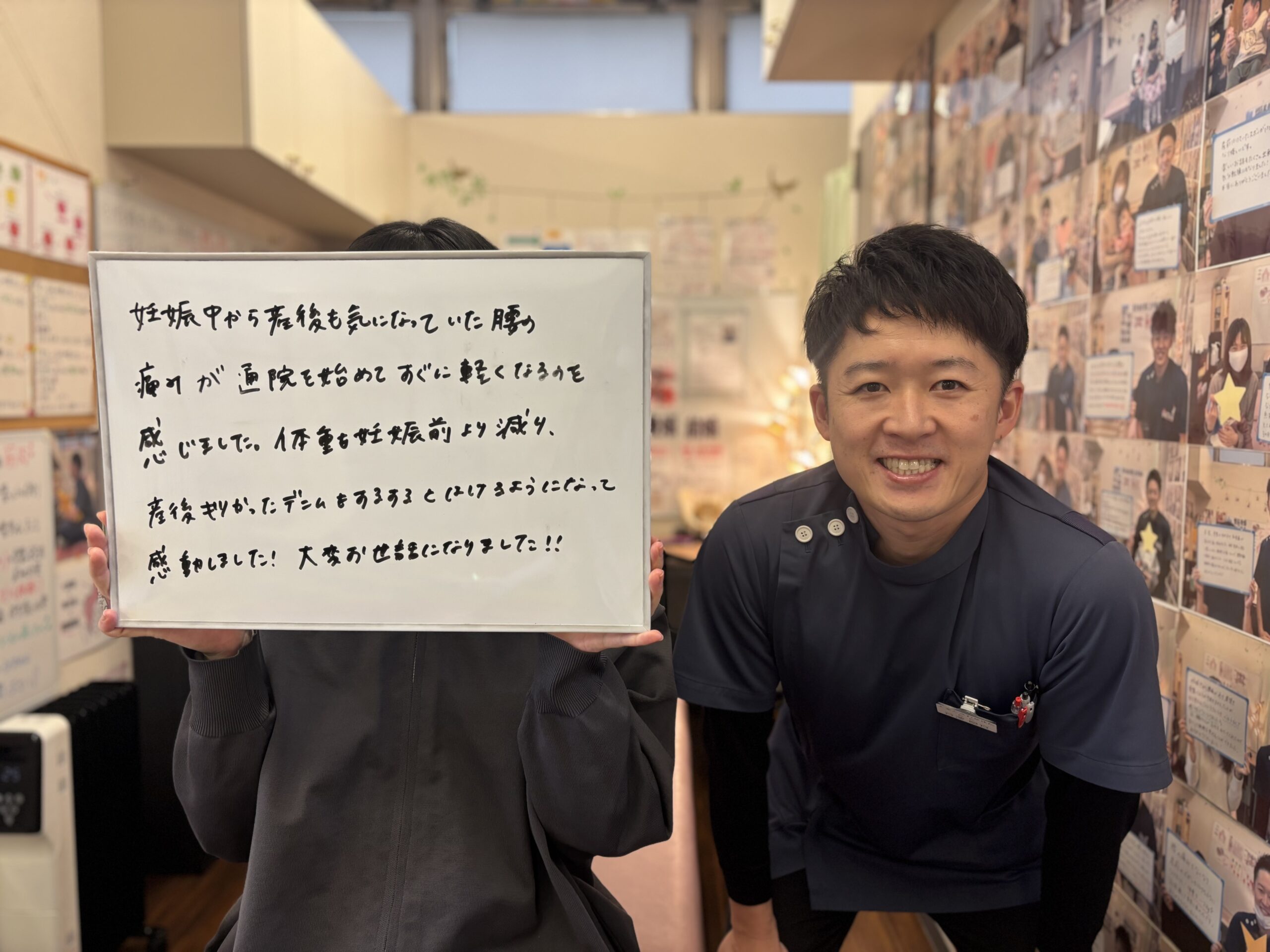 「妊娠中から産後も気になっていた腰の痛みが通院を始めてすぐに軽くなるのを感じました。体重も妊娠前より減り、産後キツかったデニムをすらすると履けるようになって感動しました!大変お世話になりました!!」