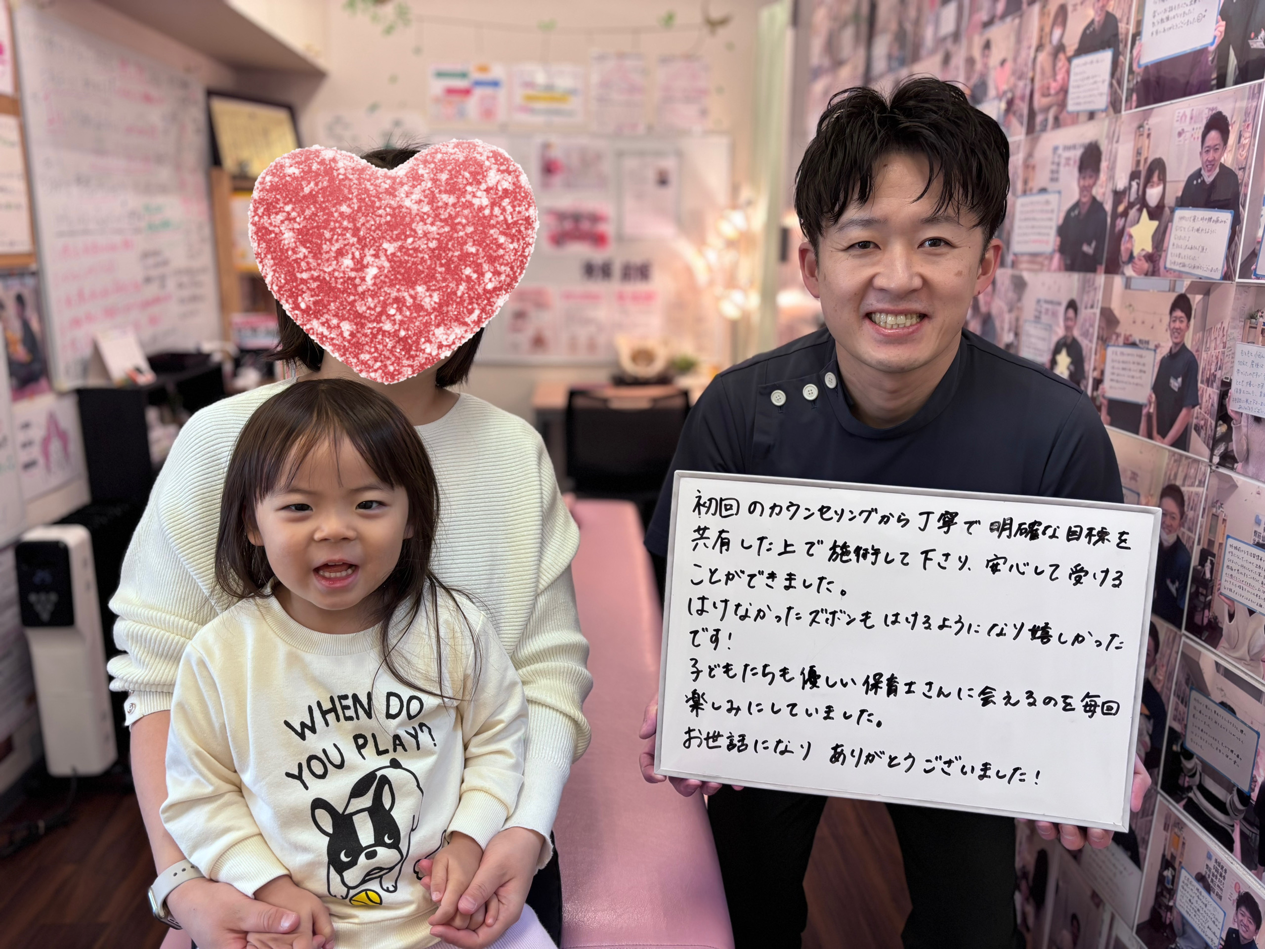 「初回のカウンセリングから丁寧で明確な目標を共有した上で施術してくださり安心して受けることができました。履けなかったズボンもはけるようになり嬉しかったです!子どもたちも優しい保育士さんに会えるのを毎回楽しみにしていました♪お世話になりありがとうございました!!」